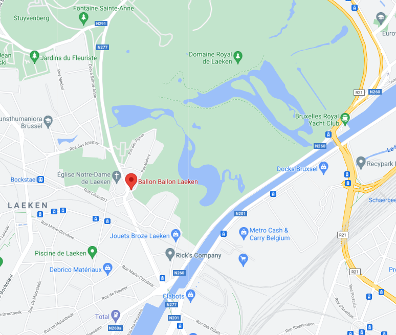 Vlakbij het Koninklijk Paleis van Laken, tegenover de Onze-Lieve-Vrouwekerk van Laken. Ring rond Brussel, afslag Laken, richting stadscentrum. Gemakkelijk parkeren.