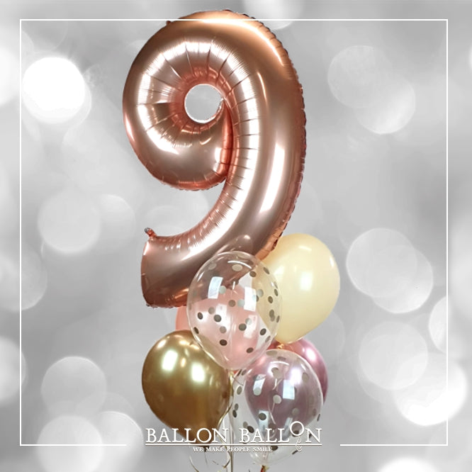 Boeket van 6 biologisch afbreekbare latex ballonnen in verschillende kleuren + 1 groot roze-goud 90 cm helium gevuld cijfer.