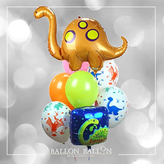 Dit boeket van 6 latex ballonnen en 2 met helium gevulde dinosaurusballonnen is ontworpen om 2-3 dagen in de lucht te zweven en is bevestigd met een leuk gewichtje.