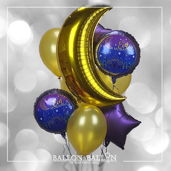 Het "Eid Mubarak" boeket bestaat uit 10 versierde ballonnen opgeblazen met helium, waaronder 5 mylar-alu (4 kleine + 1 grote) en 5 latex ballonnen.