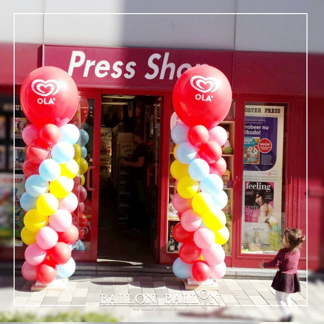Set van twee kolommen met een hoogte van 220 cm met 9 niveaus van 4 ballonnen en eindigend met een grote bijpassende ballon, vastgehouden door plastic voetjes gevuld met water, perfect voor winkelopeningen.