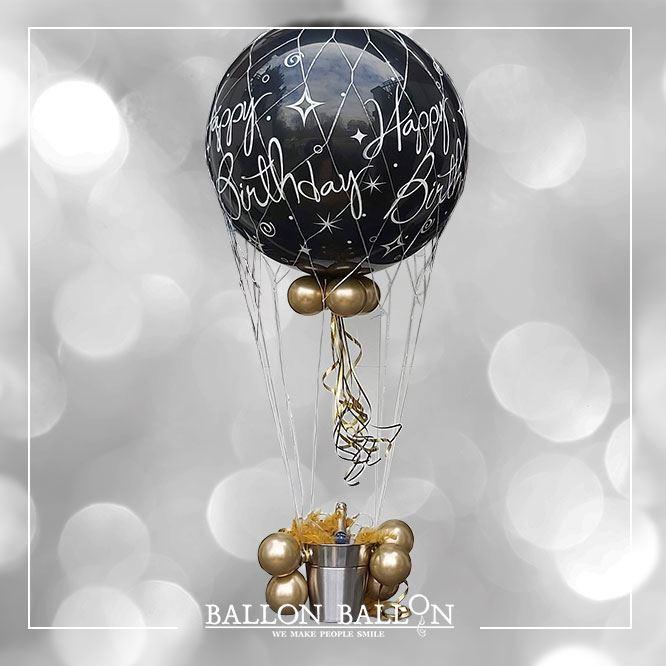 Een prachtige heteluchtballon met een zwarte "happy birthday" bedrukte ballon met een diameter van 90 cm is met een net bevestigd aan een mand, de ballon is ontworpen om 2-3 weken in de lucht te zweven.