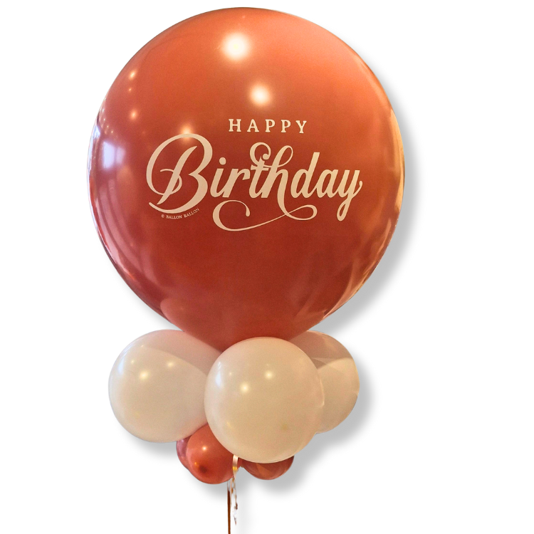 Een grote gouden biologisch afbreekbare latex ballon met "happy birthday" erop gedrukt is 90 cm in diameter. Opgeblazen met helium en bevestigd aan een gewicht is de ballon ontworpen om 2-3 weken in de lucht te zweven.
