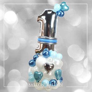 Een grote wolk van 60cm biologisch afbreekbare latex ballonnen + 1 luchtgevuld 90cm zilveren aluminium cijfer (totale afmeting 150cm).