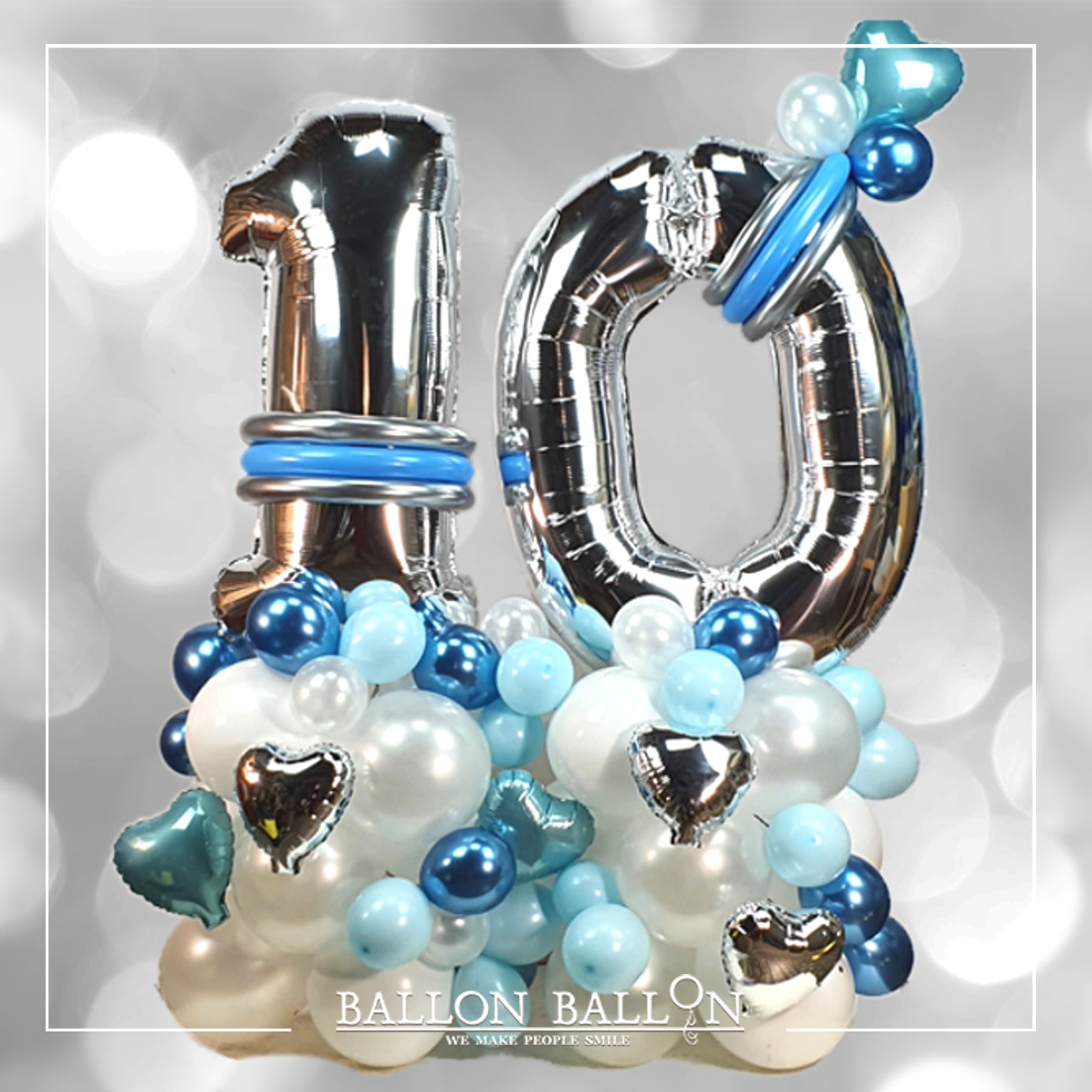 Twee grote 60cm biologisch afbreekbare latex ballonwolken + 2 luchtgevulde 90cm zilveren aluminium cijfers (totale afmeting 150cm).