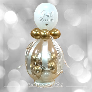 Deze magische montage van 80 cm bestaat uit een transparante ballon met wit en goude decoratie en met een "just married" bedrukte ballon.