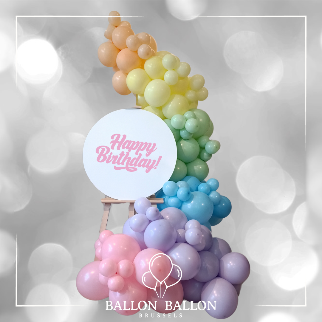 Transformeer je evenementen met onze prachtige 2 meter hoge ballonmontage, gemonteerd op een houten wandrek en versierd met een gepersonaliseerd bord met je gewenste tekst. Ideaal voor bruiloften, verjaardagen,communiefeesten, productlanceringen en meer.