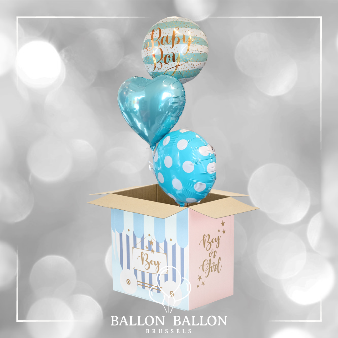 Boite de 40x60x60cm remplie de trois ballons en aluminium Bleu en forme de rond et de cœur de +- 30 cm.