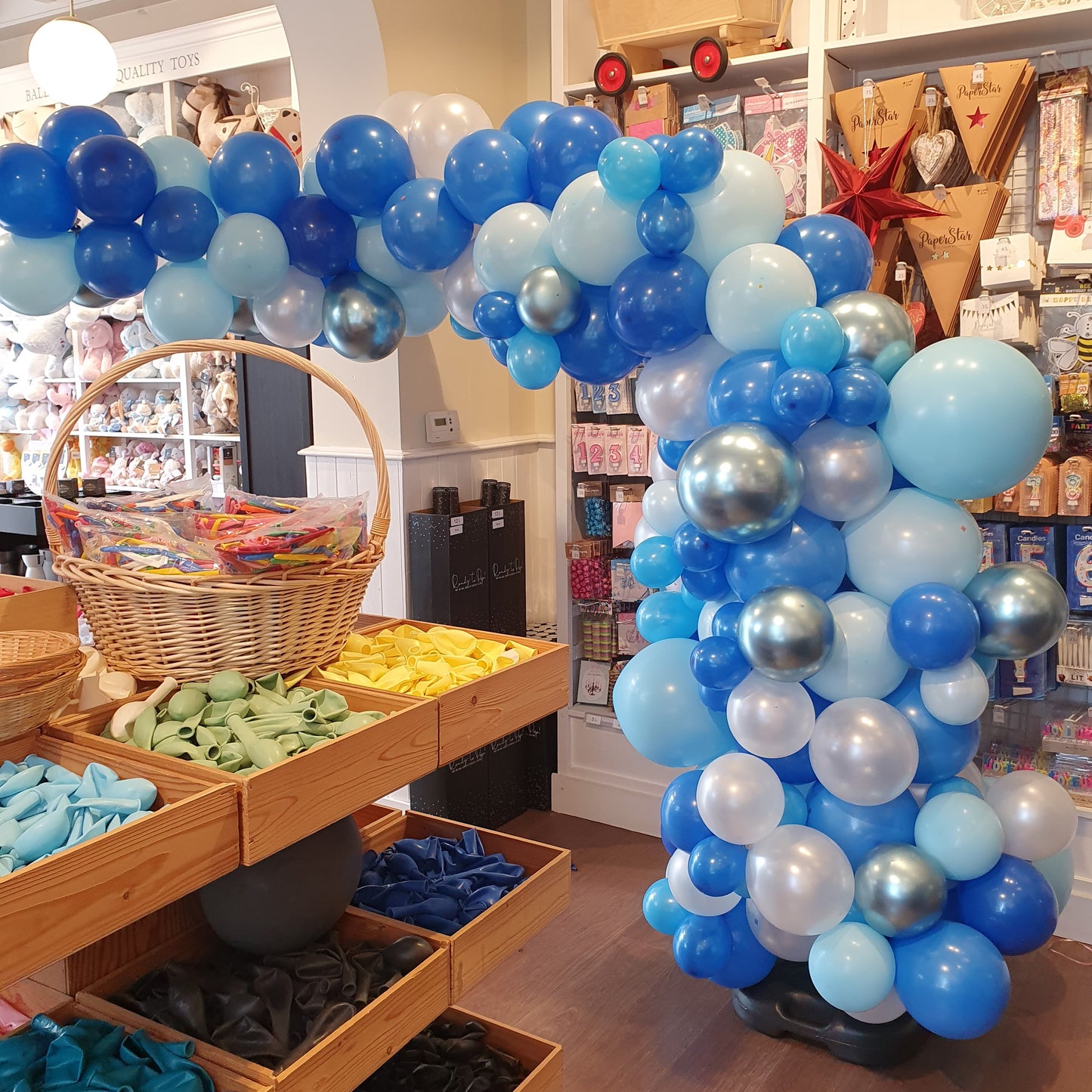 Demi Arche de ballons en latex biodégradables dans les tons de bleus, d'une taille de +/- 190 cm en hauteur et de 250 cm en longueur.