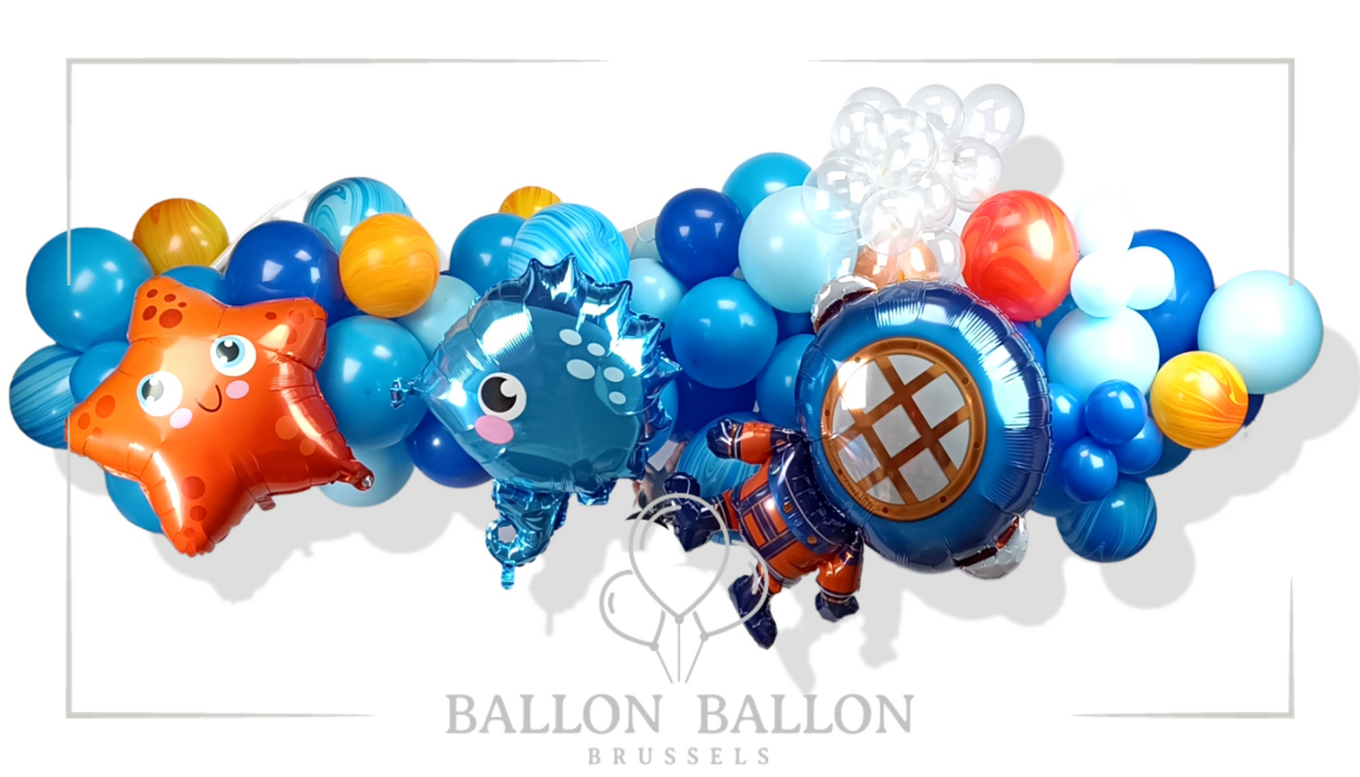 Rempli de ballons en latex biodégradables et de 2 grands ballons en aluminium sur le thème marin, elle mesure 2m de longueur et elle est facile à transporter seul.