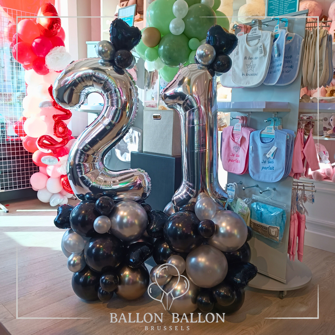 Deux gros nuages de ballons en latex biodégradables de 60cm + 2 chiffres argentés en aluminium de 90 cm gonflé à l'air (taille totale 150 cm).